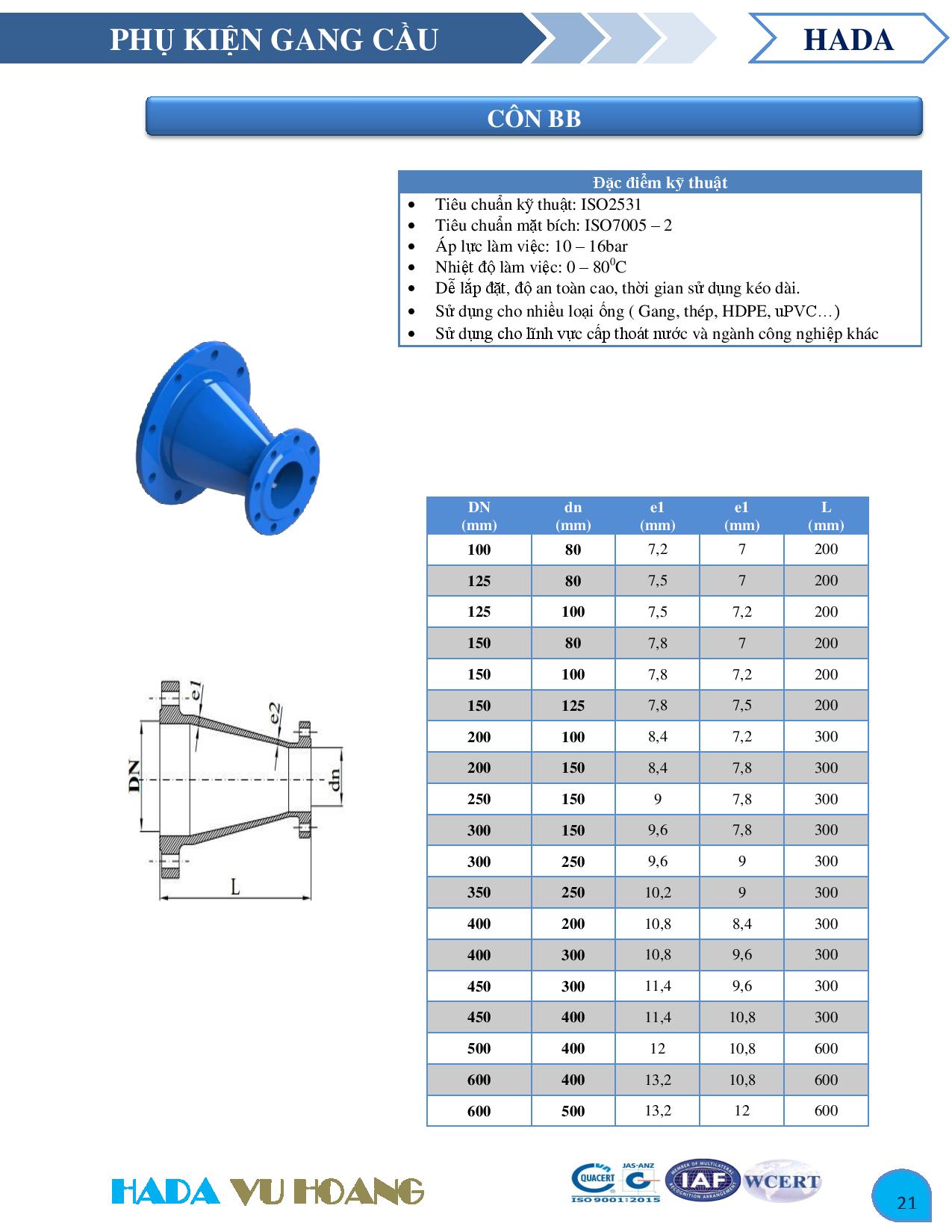 Côn gang BB HADA có tác dụng thu đường ống từ ống có kích thước lớn sang đường ống có kích thước bé hơn bằng phương pháp nối bích.