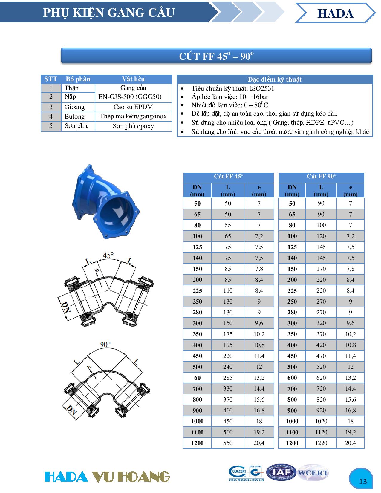 Cút gang FF HADA dễ lắp đặt, độ an toàn cao, thời gian sử dụng kéo dài. Sử dụng cho nhiều loại ống ( Gang, thép, HDPE, uPVC...)