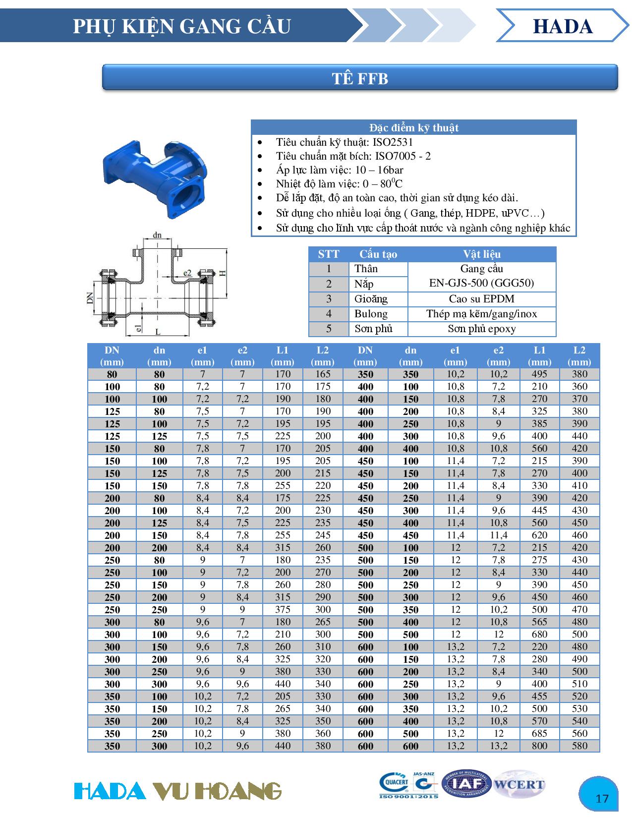 Tê gang FFB HADA dễ lắp đặt, độ an toàn cao, thời gian sử dụng kéo dài. Sử dụng cho nhiều loại ống ( Gang, thép, HDPE, uPVC...)