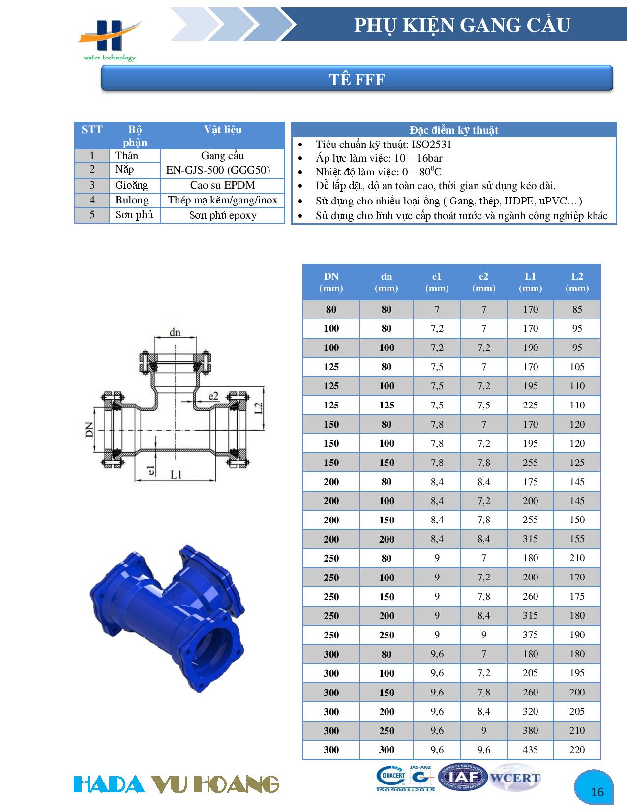 Tê gang FFF HADA dễ lắp đặt, độ an toàn cao, thời gian sử dụng kéo dài. Sử dụng cho nhiều loại ống ( Gang, thép, HDPE, uPVC...)